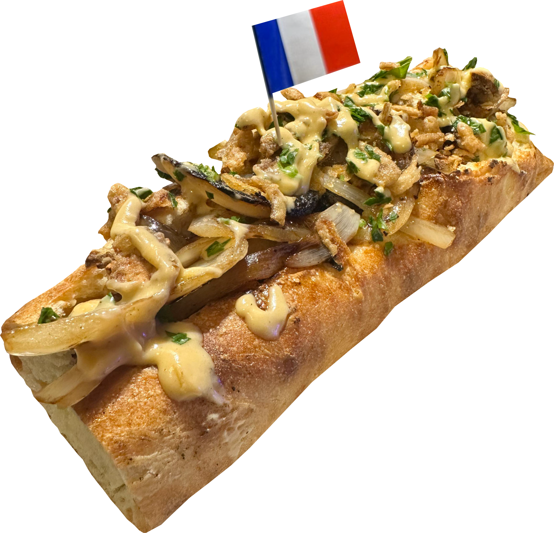 All Beef Frank wrapped with bacon served on a 6 in. organic french baguette topped with sherry dry wine reduction sautéed onions, crispy fried onions & drizzled with our in house gruyere cheese sauce.