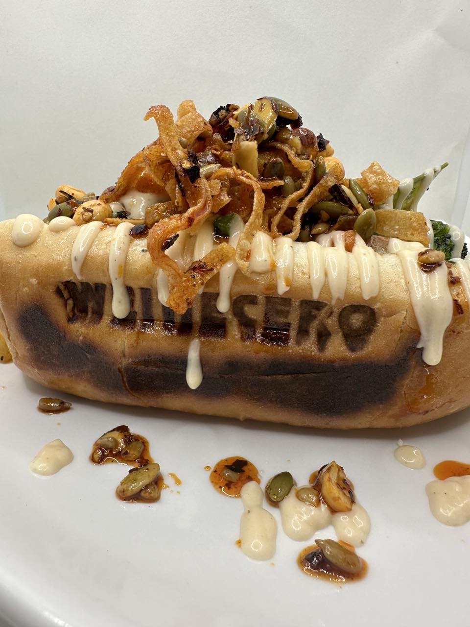 All Beef Frank wrapped with bacon topped with Chinese Veggies mixed w/Soy, Ginger, Jiàng drizzled with Coconut Sauce topped w/Hot oil, Mix Nuts & Crispy Wontons.
